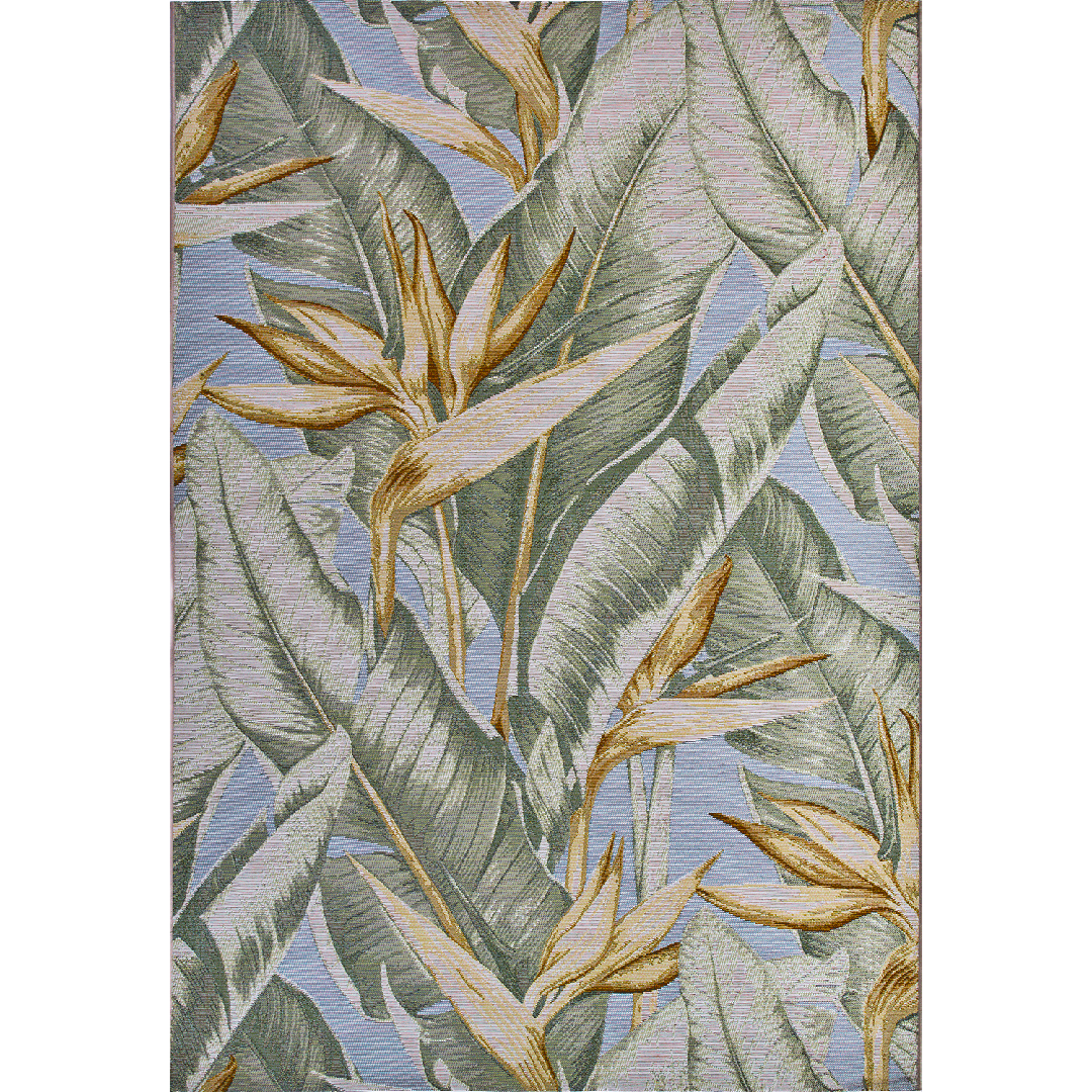 tappeto AMAZZONIA 1044/Q04 X cattura l'essenza della natura tropicale con il suo straordinario motivo di foglie lussureggianti e fiori stilizzati, immersi in tonalità verdi e sfumature dorate su uno sfondo celeste. La tessitura piatta uniforme evidenzia ogni dettaglio del design, creando un effetto visivo elegante e sofisticato. Questo tappeto, fatto a macchina, è un complemento d'arredo ideale sia per spazi interni che esterni, unendo praticità e bellezza in un unico prodotto.