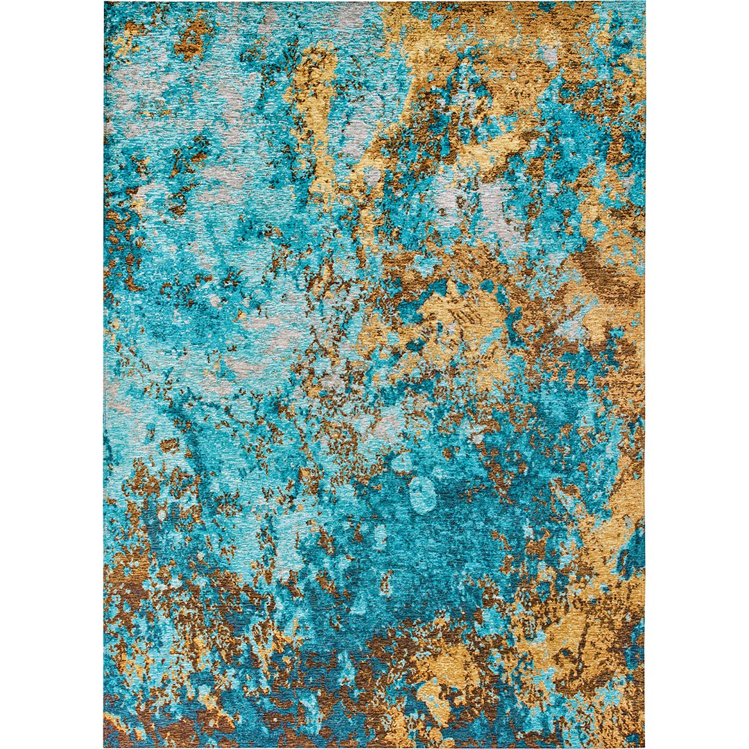 Il tappeto ANDY 203X/Q01 presenta una combinazione di colori vivaci e texture artistiche, con tonalità di azzurro intenso e oro che creano un effetto astratto e dinamico. Questo tappeto, prodotto con tessitura piatta fatta a macchina, è ideale per arricchire salotti e spazi moderni con un tocco di design contemporaneo e qualità italiana.