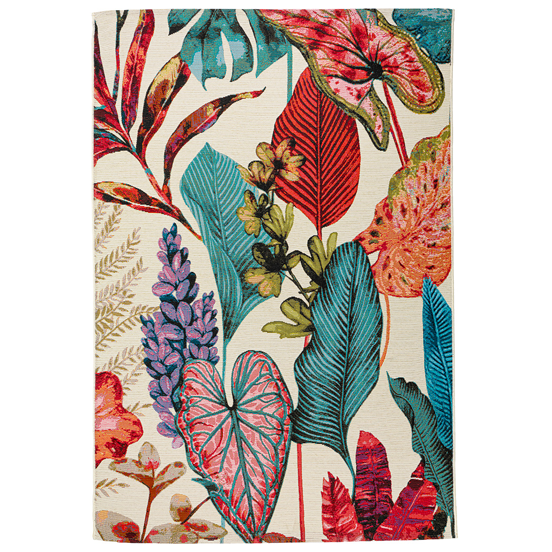 Il tappeto AMAZZONIA 2648/Q04 colpisce subito per il suo motivo botanico esuberante: grandi foglie e fiori tropicali si intrecciano in una danza cromatica che spazia tra il verde smeraldo, il rosso corallo, il viola lavanda e l’azzurro intenso, il tutto su uno sfondo chiaro che ne esalta la vivacità. La stampa, perfettamente bilanciata, evoca la bellezza lussureggiante della foresta amazzonica, conferendo energia e personalità a ogni spazio esterno. La lavorazione fatto a macchina garantisce precisione nei dettagli e resistenza nel tempo.