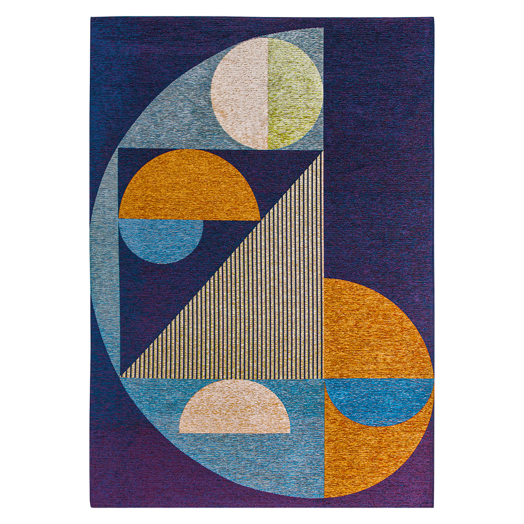 Il tappeto ANDY 1045K/Q01 presenta un sorprendente design geometrico che combina cerchi, triangoli e linee in un contrasto armonioso di colori vivaci come blu, giallo oro e verde, su una base di tonalità profonde. L'effetto visivo è contemporaneo e sofisticato, perfetto per completare l'arredamento di un salotto moderno con un tocco di stile unico. La produzione Fatto a macchina assicura una qualità impeccabile e una lavorazione di precisione, adatta a soddisfare anche i clienti più esigenti.