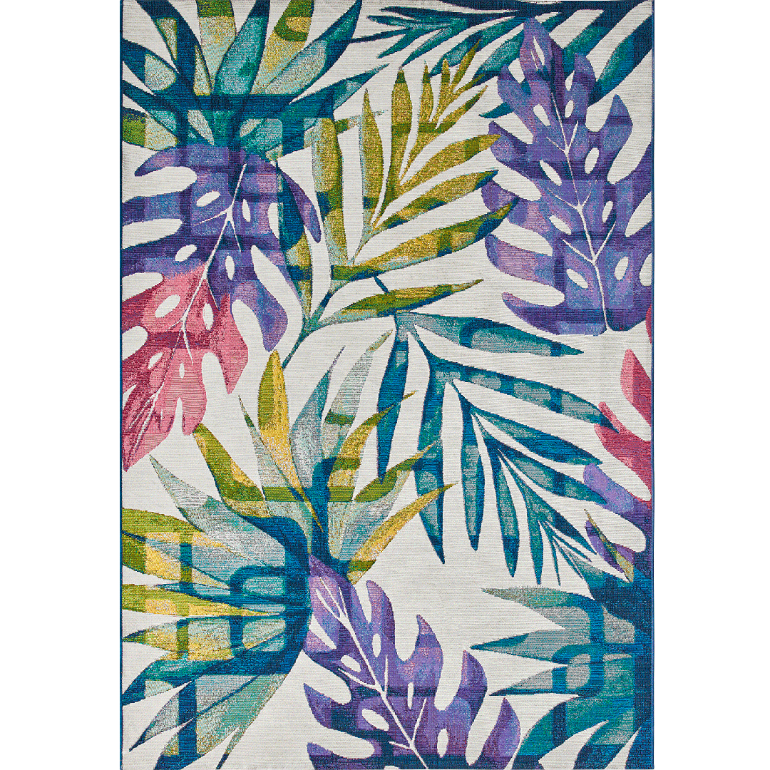 Il tappeto AMAZZONIA 1073/Q03 X è un inno alla natura, con un motivo vivace di foglie tropicali nei toni del verde, viola e fucsia, che si intrecciano armoniosamente su uno sfondo chiaro. Questo design dona un’energia vibrante a qualsiasi spazio, rendendolo perfetto sia per interni che per esterni. La tessitura piatta uniforme, ottenuta tramite una produzione meccanica di alta precisione, enfatizza la nitidezza del disegno e garantisce una qualità durevole nel tempo.