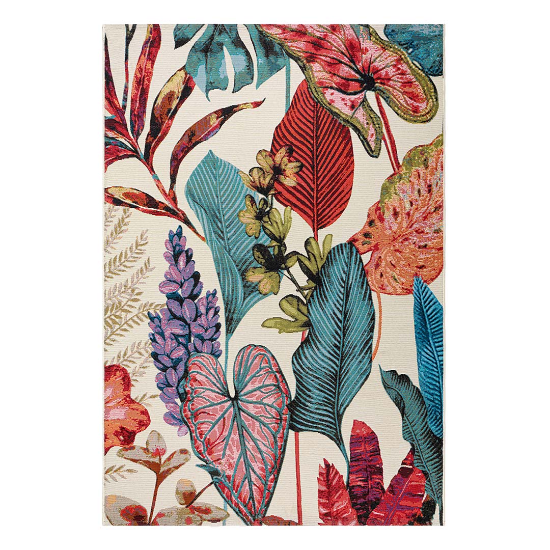 Il tappeto AMAZZONIA 2648/Q04 colpisce subito per il suo motivo botanico esuberante: grandi foglie e fiori tropicali si intrecciano in una danza cromatica che spazia tra il verde smeraldo, il rosso corallo, il viola lavanda e l’azzurro intenso, il tutto su uno sfondo chiaro che ne esalta la vivacità. La stampa, perfettamente bilanciata, evoca la bellezza lussureggiante della foresta amazzonica, conferendo energia e personalità a ogni spazio esterno. La lavorazione fatto a macchina garantisce precisione nei dettagli e resistenza nel tempo.