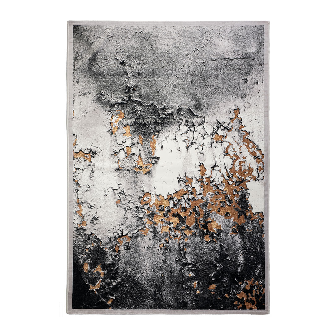 Il tappeto GABRIELLE 491E/Q13 combina una sofisticata texture materica con dettagli dorati, creando un effetto visivo di grande impatto. Le tonalità neutre nere e grigie si mescolano armoniosamente con tocchi di oro, rendendolo una scelta ideale per soggiorni eleganti e camere da letto raffinate. La produzione meccanica garantisce una lavorazione precisa, enfatizzando i rilievi e la qualità del disegno.