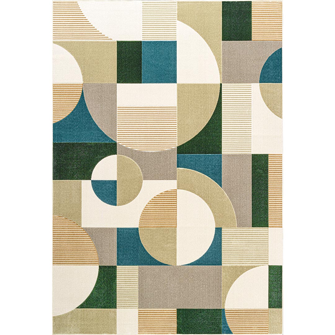 Porta un tocco di design contemporaneo al tuo ambiente con il tappeto VITTORIA 9780017/6242. Un motivo geometrico raffinato in tonalità armoniose di verde, beige e blu, perfetto per valorizzare gli interni più moderni. Le linee pulite e i cerchi sovrapposti creano un effetto visivo sofisticato, rendendo questo tappeto un complemento ideale per salotti e soggiorni in cerca di stile ed equilibrio.